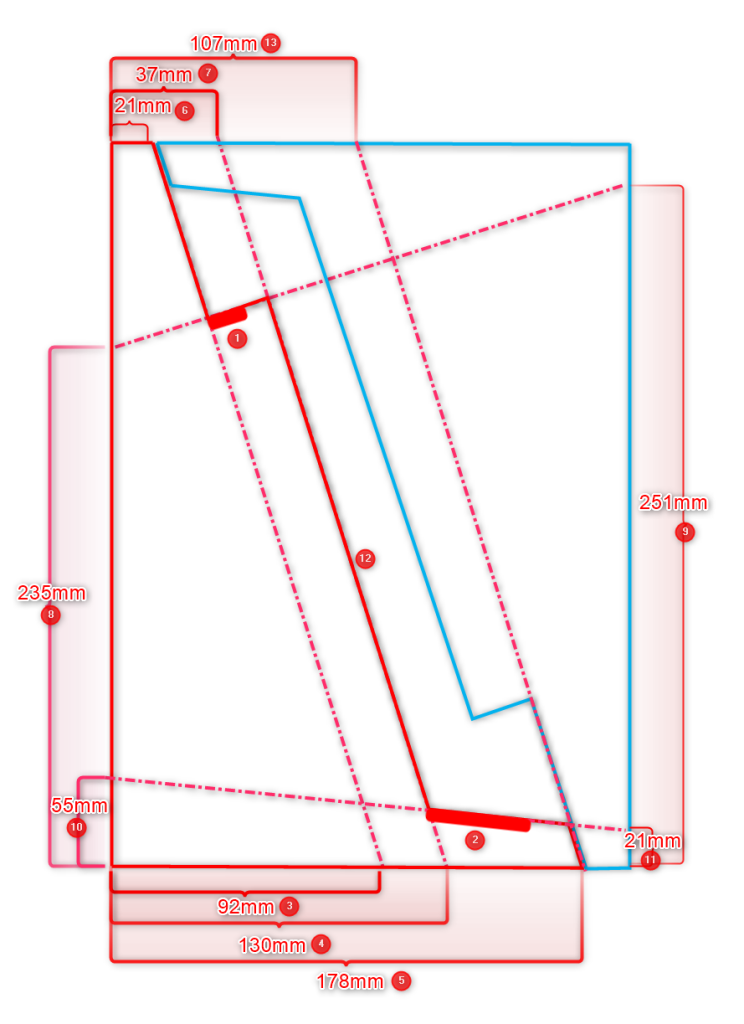 ノートPCを外した時にスタンドに乗せているiPadが後ろに倒れるのを防ぎたい場合は板サイズの短辺をを22cmくらいに伸ばして、(3)〜(7)の部分のサイズに同じ長さのオフセットをかければ、iPadの重心がスタンドの中心に移動し安定性が増します。