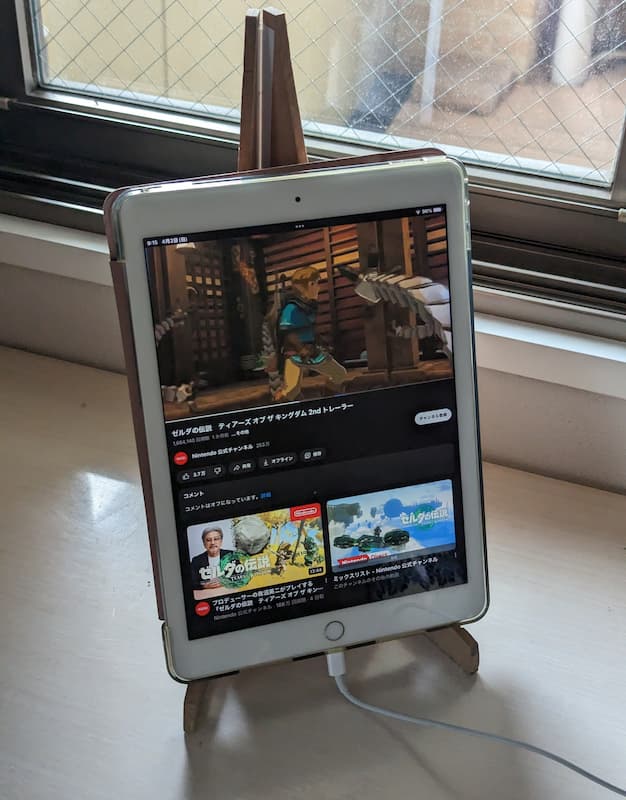 このスタンドは下記のようにiPadのスタンドとしても利用できます。立てかけた時の角度は垂直に近くなるので、新幹線や飛行機などのテーブルに立てかけて動画を見る場合にも便利です。下に隙間が開くので写真のように充電しながらの縦位置視聴もできます。