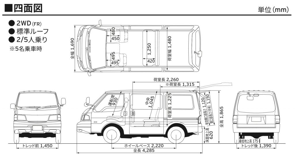 Bongo以外で自転車を選ぶ際の基準になる、Bongoの車両諸元情報は以下のとおりです。この荷室サイズを最小として車を選ぶといいです。