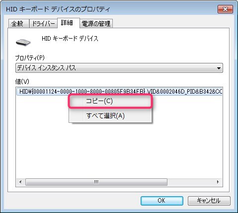 - 「詳細」タブのデバイスインスタンスパスを開き、値を記録する