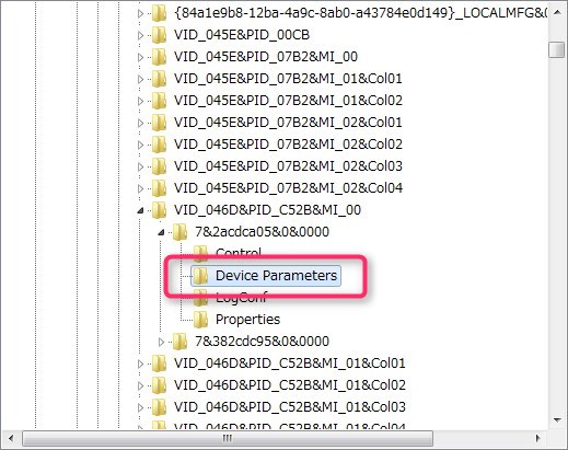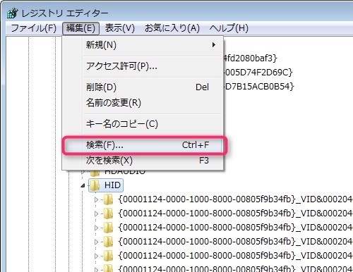- 「検索」でStep3のキーを捜す。過去に別のUSBポートにさしたことがある場合は、複数存在するので注意