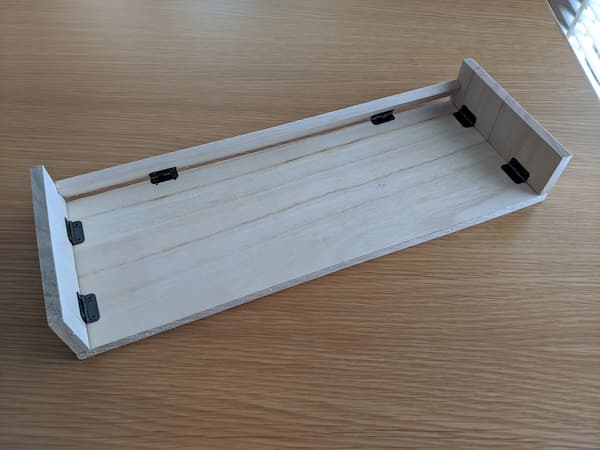 これらの問題を解決するため、ページトップの写真にようなモバイルモニター台を作成しました。Can-Doで450mm-150mmのバルサ板と蝶番6個セットで合計220円。下記のようにカットして、蝶番で接合します。