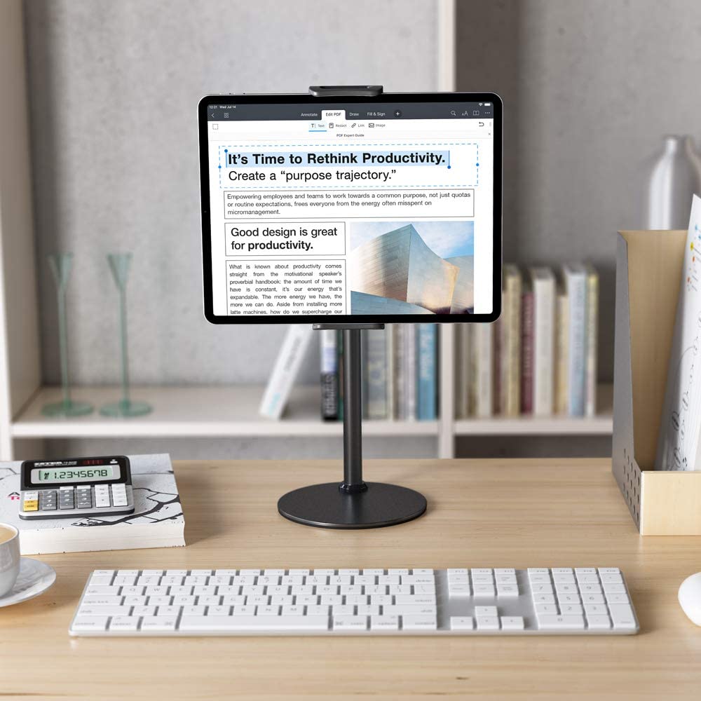 解決策として下記のようなタブレットスタンドを導入してみましたが、今度は高すぎたり角度がうまく調整できないなど、いまいちしっくりきません。なによりこの手のスタンドは重くて嵩張るため、持ち運びには向きません。