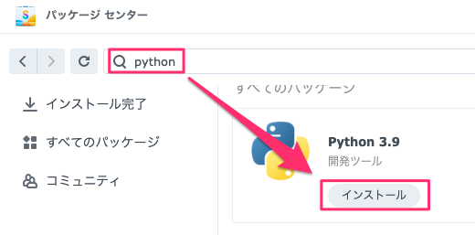 Pythonはパッケージセンターのものを指定してインストールすればいいです。バージョンは3.9以上であれば問題はないと思います。