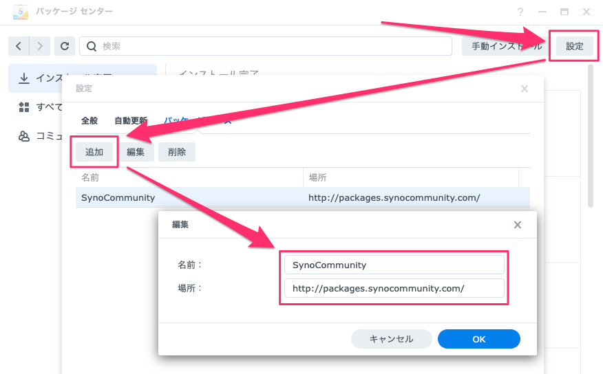 Fig. パッケージセンターのコミュニティに http://packages.synocommunity.com/ を追加