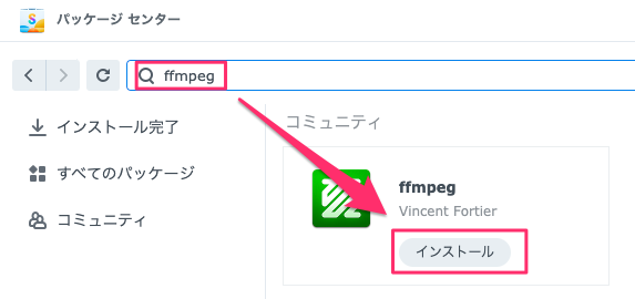しかし、Synologyにデフォルトでインストールされているffmpegのバージョンは4.1.3と大変古く、上記の方法によるダウンロードができません。このため、有志が配布しているffmpegを下記手順でインストールする必要があります。(2022年11月16日現在では4.4.2がインストールされます)