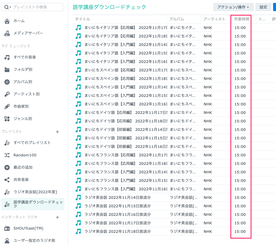 SynologyのAudioStationにはファイルサイズを表示する機能はないので、ファイル再生時間が全て15分になっているかどうかでダウンロードが正しく行われているかを確認しています。