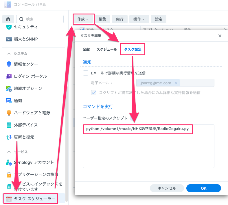 また、SynologyのNASはスケジュール実行が簡単に設定できるので、定期的なダウンロード処理をする手段として使わない手はありません。