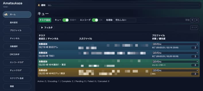 $ /home/ユーザー名/Amatsukaze/exe_files/AmatsukazeAddTask -f <tsファイル> -o <出力先ディレクトリ> -ip localhost -s <プロファイル名>変換が行われているかどうかはAmatsukazeのWebUI(http://localhost:32769)で確認します。