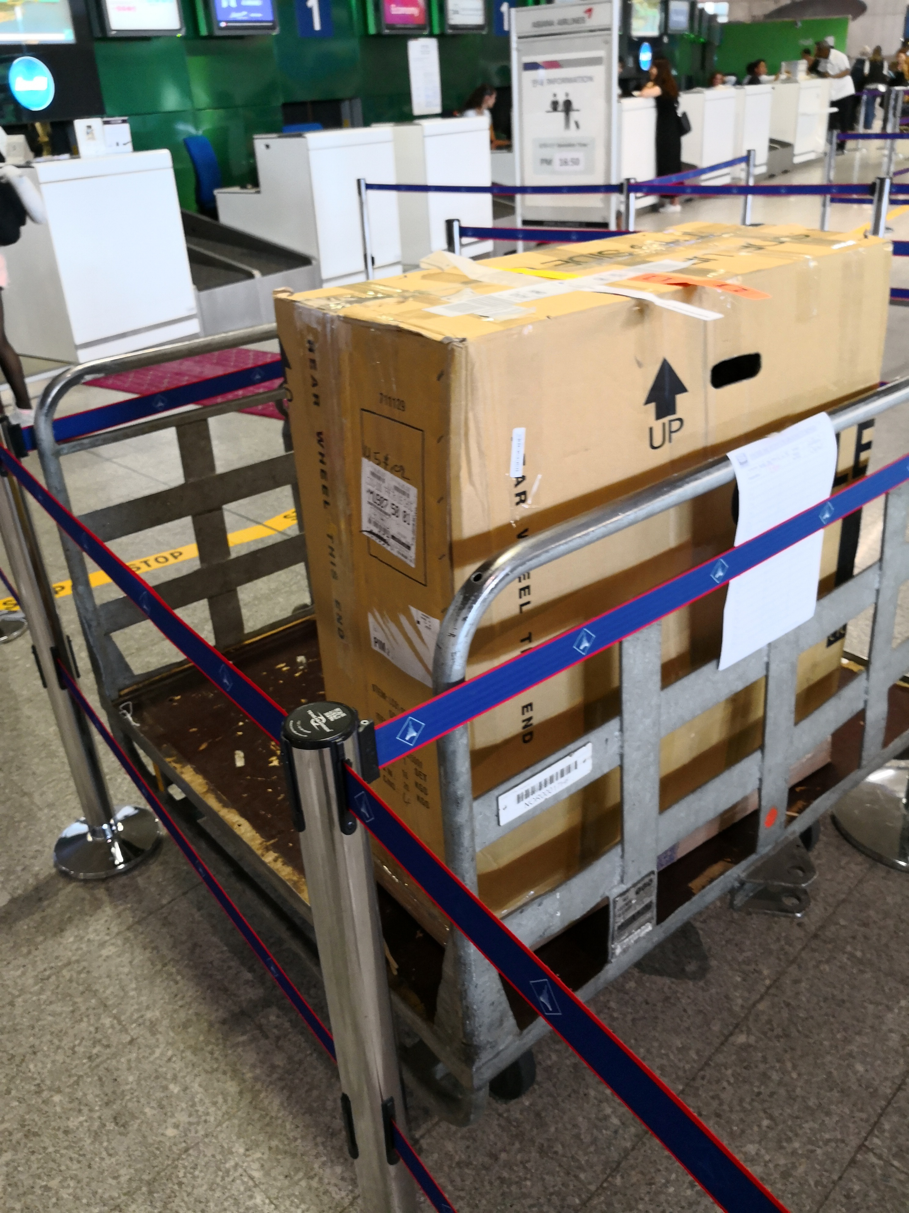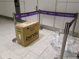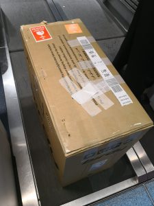 なお、パッキングの際には横倒しにされても問題がないように、ビニールに詰めた洋服などで自転車を固定すべきです。飛行機への積載時は空港職員に積み方を委ねることになります。箱の中身が自転車であること、横倒しはしないようにすることを最大限アピールするように箱には書いておけは、日本での積み込みは大丈夫だと思います。ですがトランジットがある場合は載せ替え時にどのように積まれるかは、国によって扱い方がかわるため、実際のところどうなるかはわかりません。上面をフラットにして、上に少々のものを置いても大丈夫なようにしておけば、横倒しにされることはないと思いますが、事故なく確実に持っていくためにもこれくらいの配慮はしておいた方が良いです。